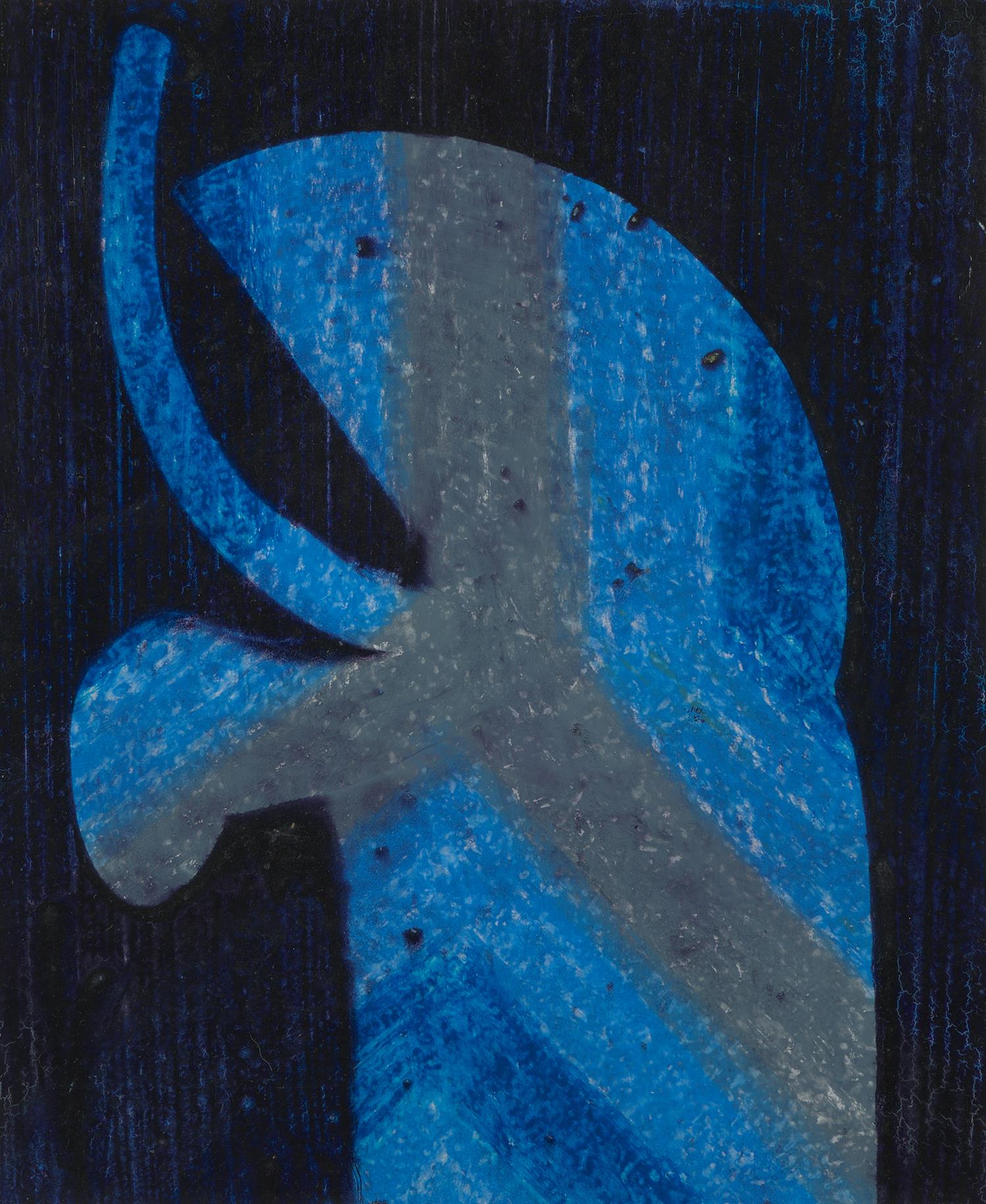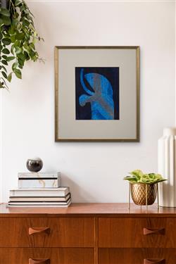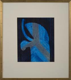Work is in very good condition. Light, hairline cracking in the surface of the paint in evident in the lower left and right corners (areas of heavy dark pigment). Framed, with overall size: 52.5 x 46cm