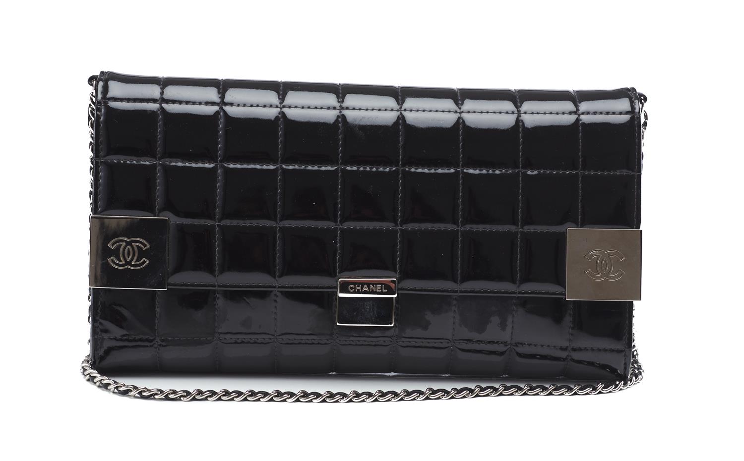 Styled in black patent leather with silver metal hardware and conforming chain shoulder strap, 28 x 16 x 5cm.