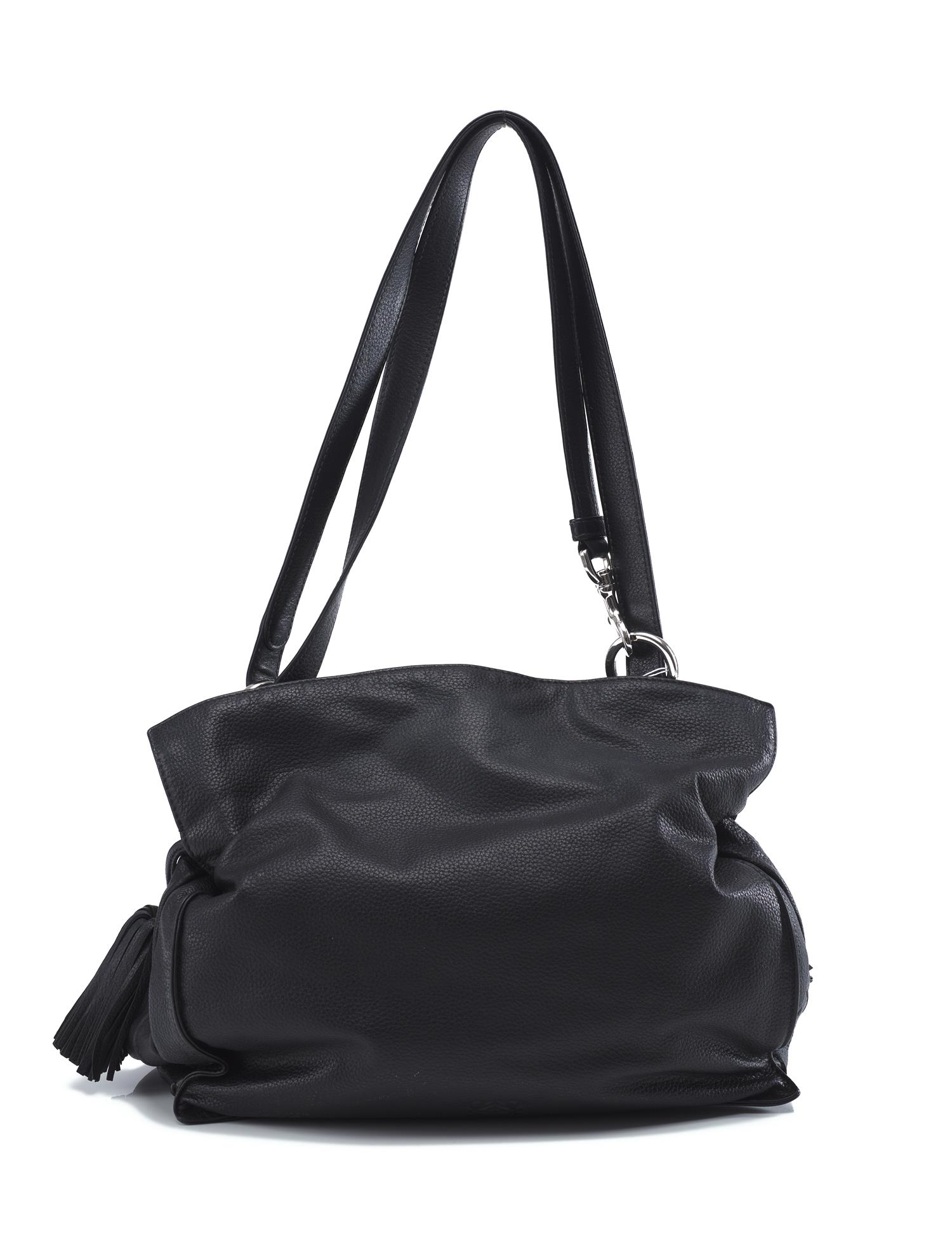 Styled in black leather with silver metal hardware, 28 x 26 x 10cm.