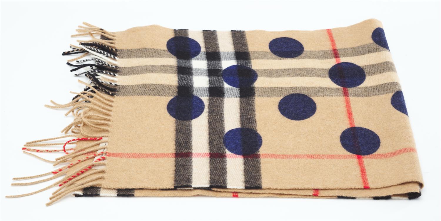 Styled with signature 'Burberry check' with contrast blue polka-dot detail to the reverse, 168 x 31cm.