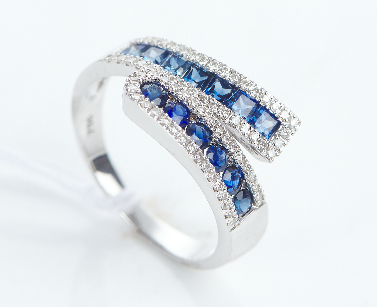 A SAPPHIRE AND DIAMOND DRESS RING OF CROSSOVER DESIGN IN 18CT WHITE GOLD, SAPPHIRES TOTALLING 1.02CTS AND DIAMOND 0.25CT, SIZE M, 3GMS