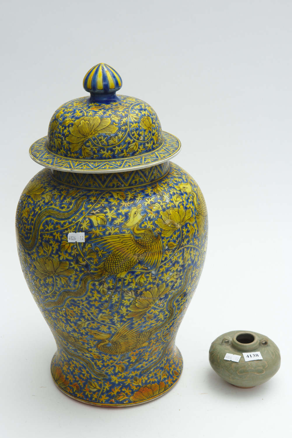 A LARGE CHINESE PORCELAIN LIDDED JAR H.48CM (REPAIRS) AND A CELADON POT, LEONARD JOEL DELIVERY SIZE: SMALL