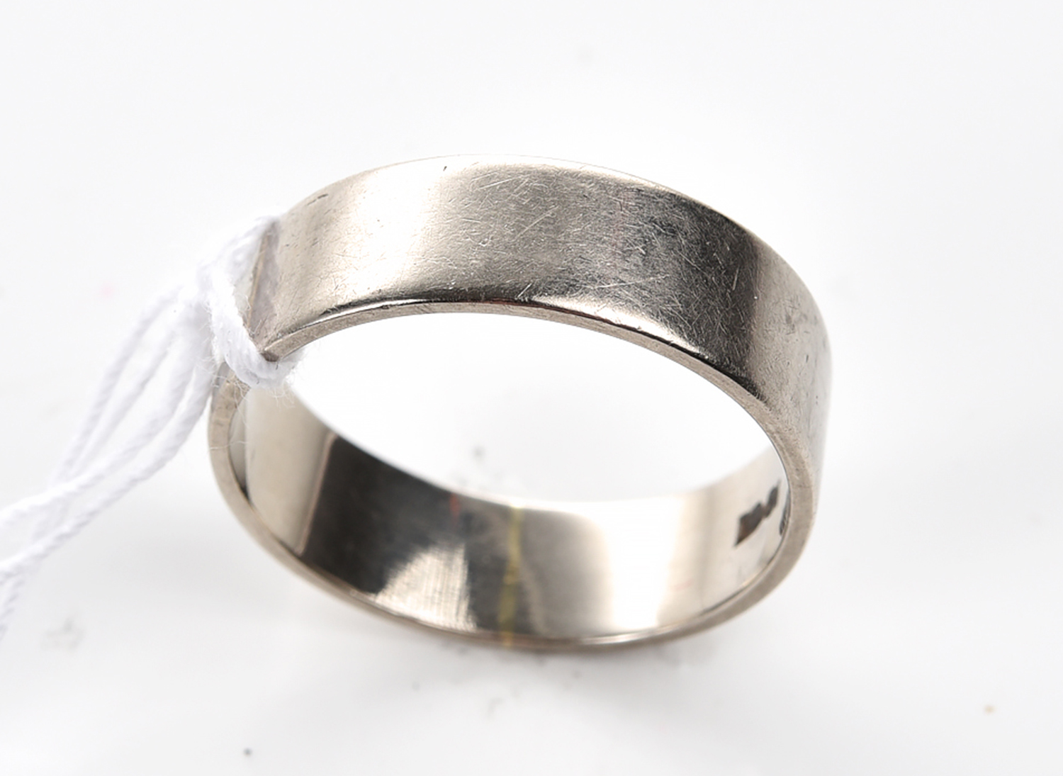 A WIDE BAND IN 18CT WHITE GOLD, SIZE R, 5.5GMS