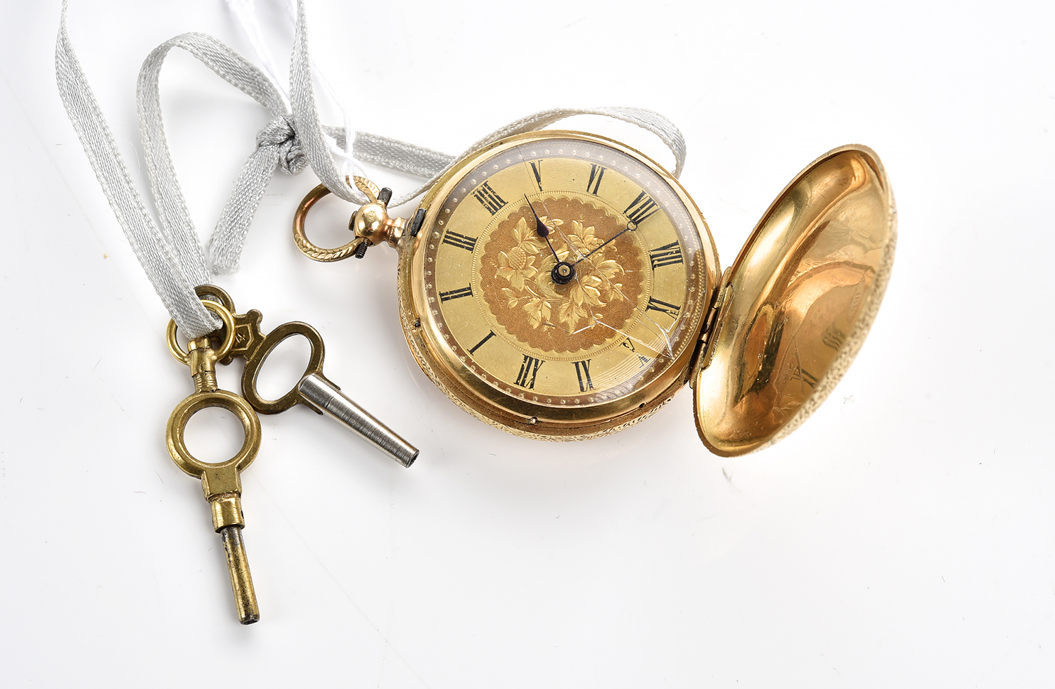 A POCKET WATCH IN 18CT GOLD, GLASS A/F, WITH TWO KEYS, TOTAL WEIGHT 46.5GMS