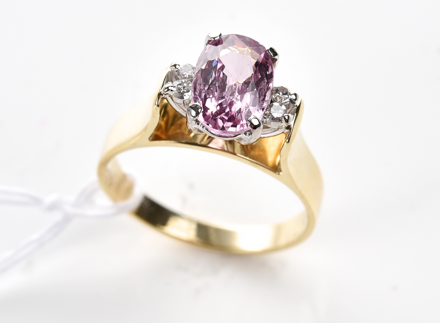 A PINK SPINEL AND DIAMOND DRESS RING IN 18CT TWO TONE GOLD, THE OVAL CUT SPINEL WEIGHING 2CTS, SIZE O, 4.7GMS
