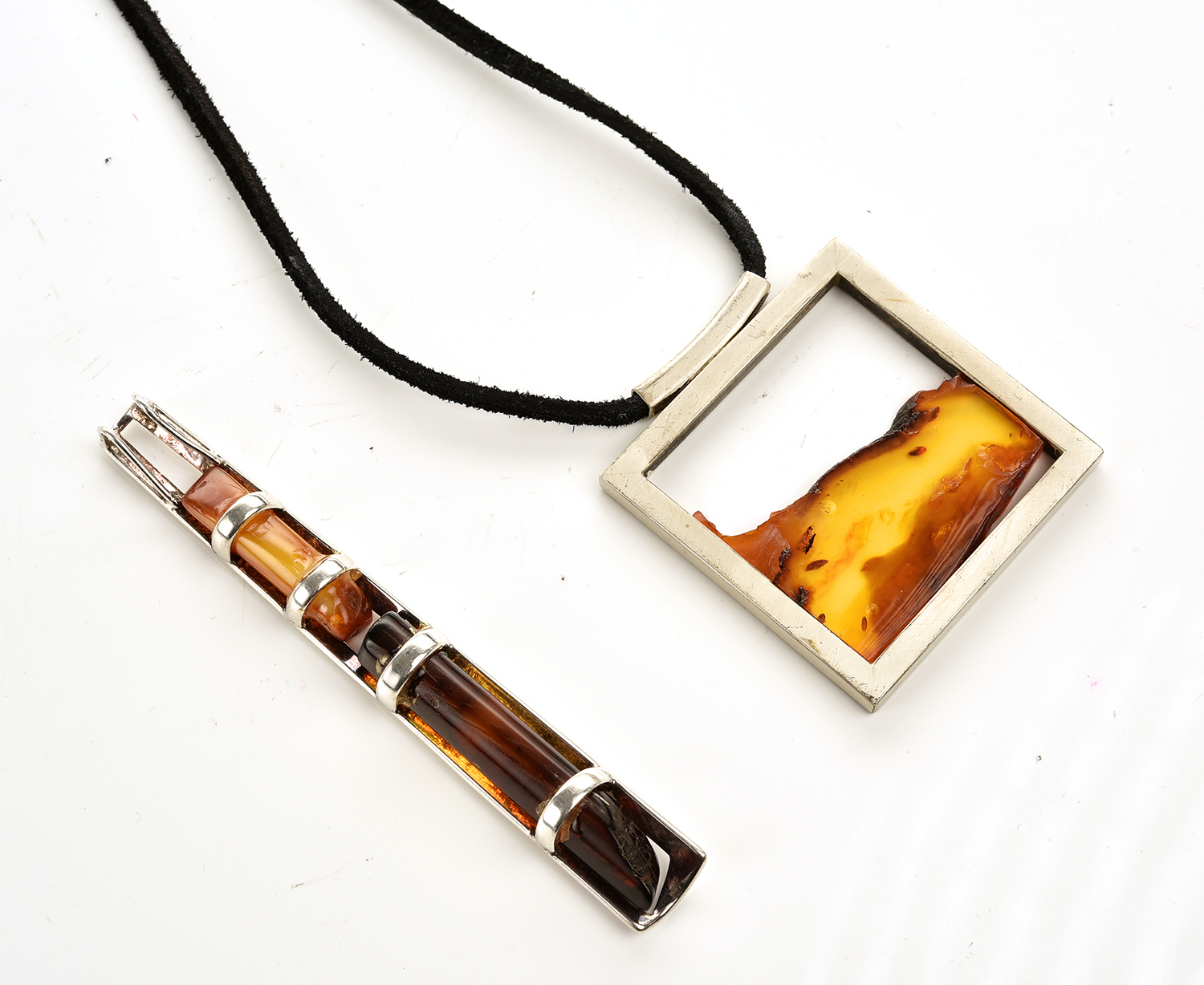 TWO AMBER SET PENDANTS IN STERLING SILVER, ONE ON LEATHERETTE CORD