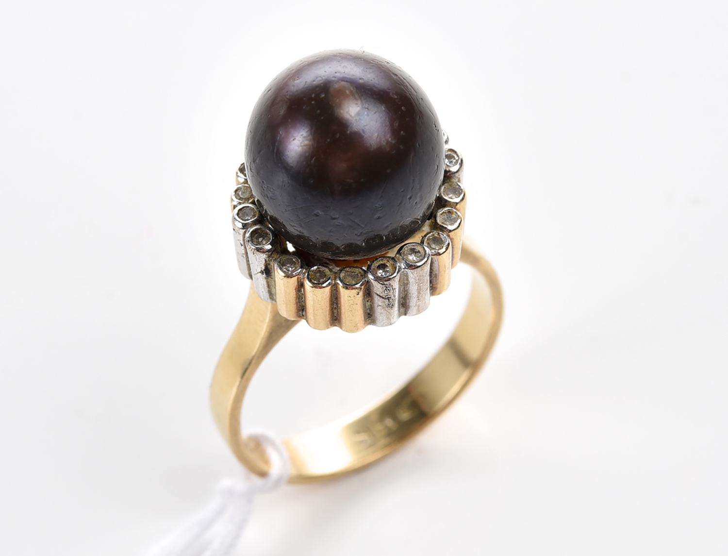 A TAHITIAN PEARL AND DIAMOND DRESS RING IN 14CT GOLD, THE PEARL MEASURING 11.6MM, SIZE Q, 8.3GMS