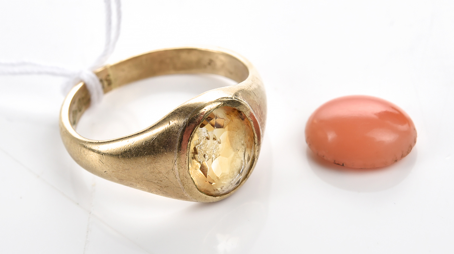 A CITRINE SIGNET RING IN 9CT GOLD, SIZE J, 3.5GMS, TOGETHER WITH A LOOSE CORAL, SIZE T