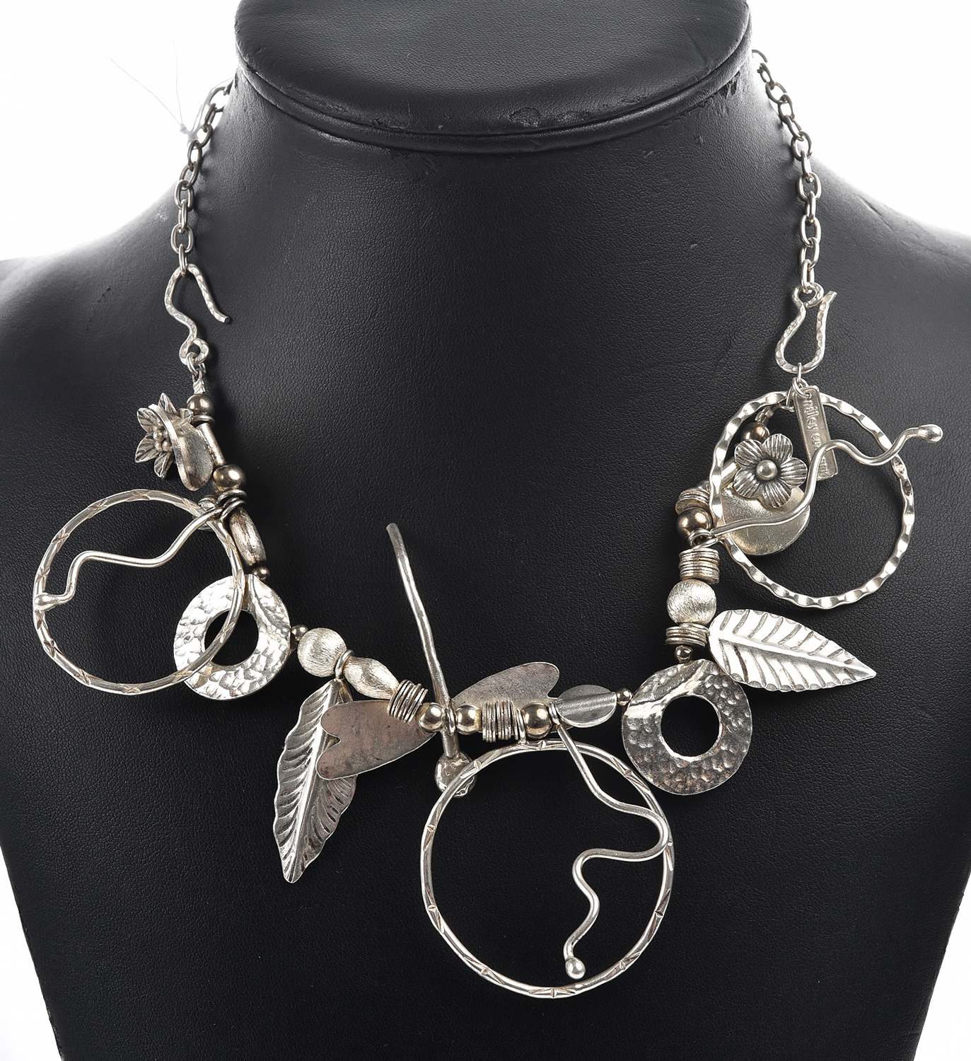 A HANDCRAFTED SILVER NECKLACE CONVERTING TO A BRACELET WITH ASSORTED CHARMS