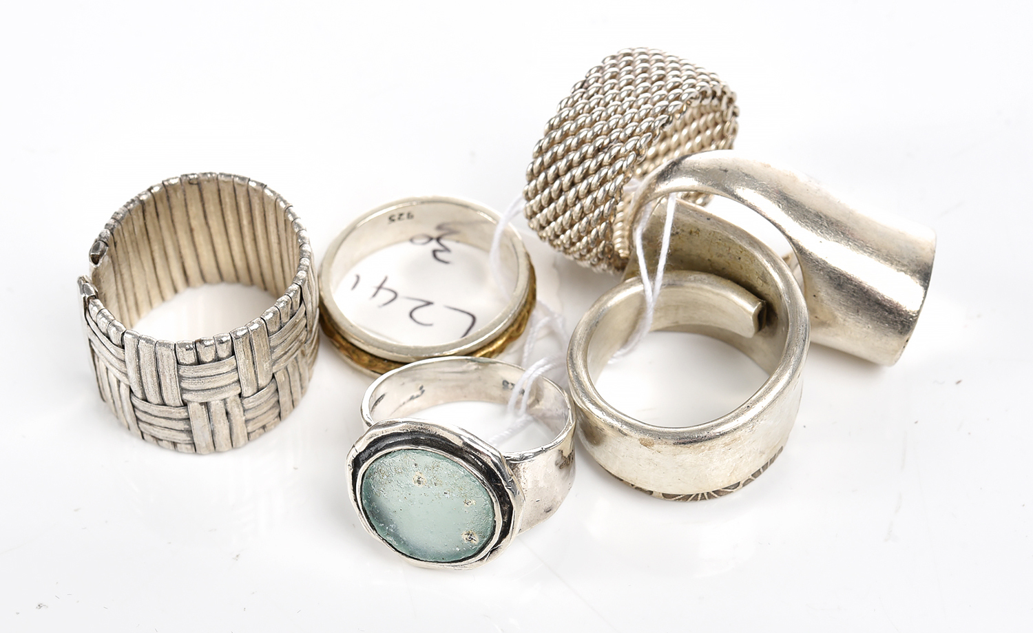 A COLLECTION OF SIX STERLING SILVER STONE SET RINGS, SIZES O, P, P, R, S, T