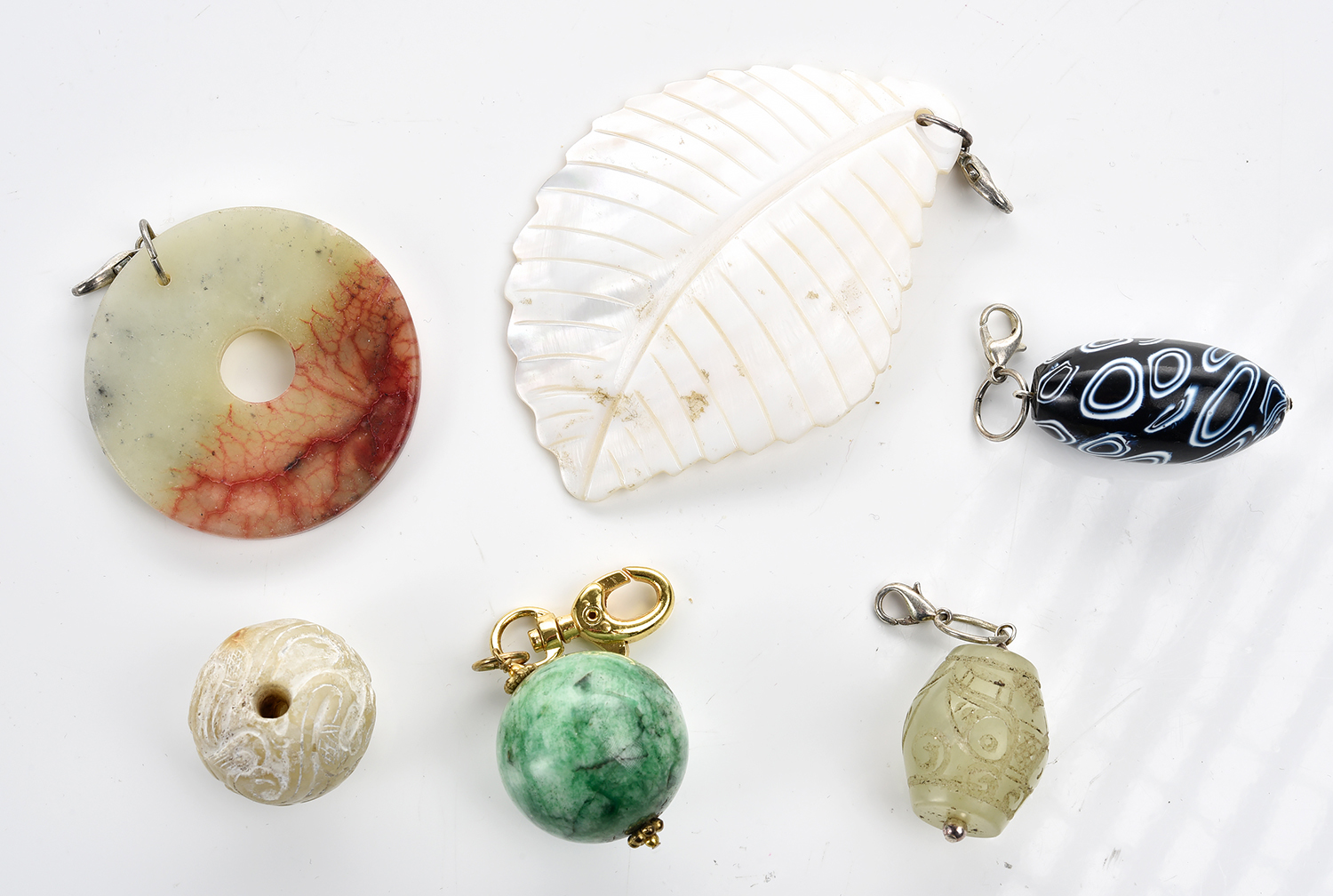 A COLLECTION OF DYED JADE AND HARDSTONE PENDANTS AND A MOTHER OF PEARL AND MILLE FIORE PENDANT