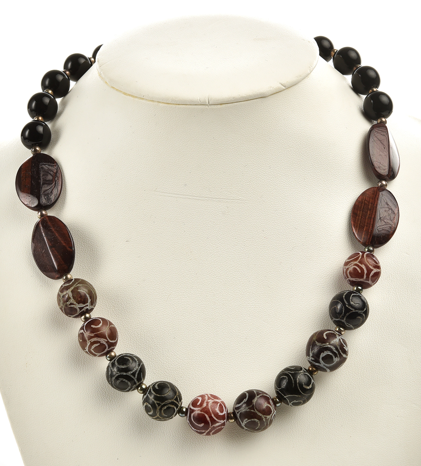 A DYED JADE BEAD AND IRONSTONE NECKLACE