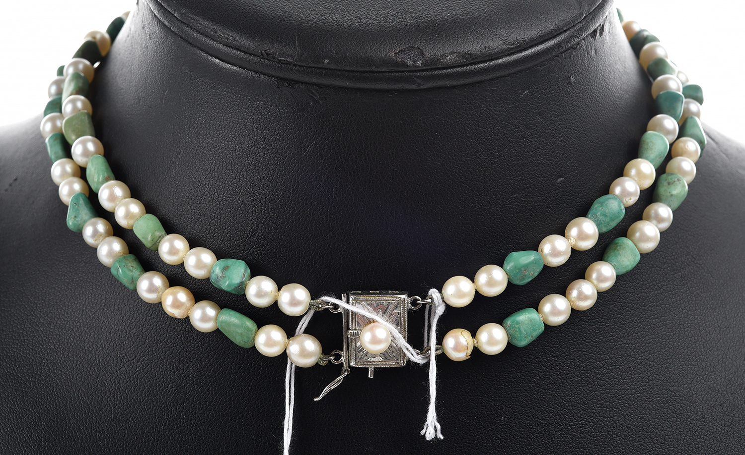 A TUMBLED TURQUOISE AND PEARL NECKLACE TO A SILVER CLASP, TOTAL LENGTH 36CM