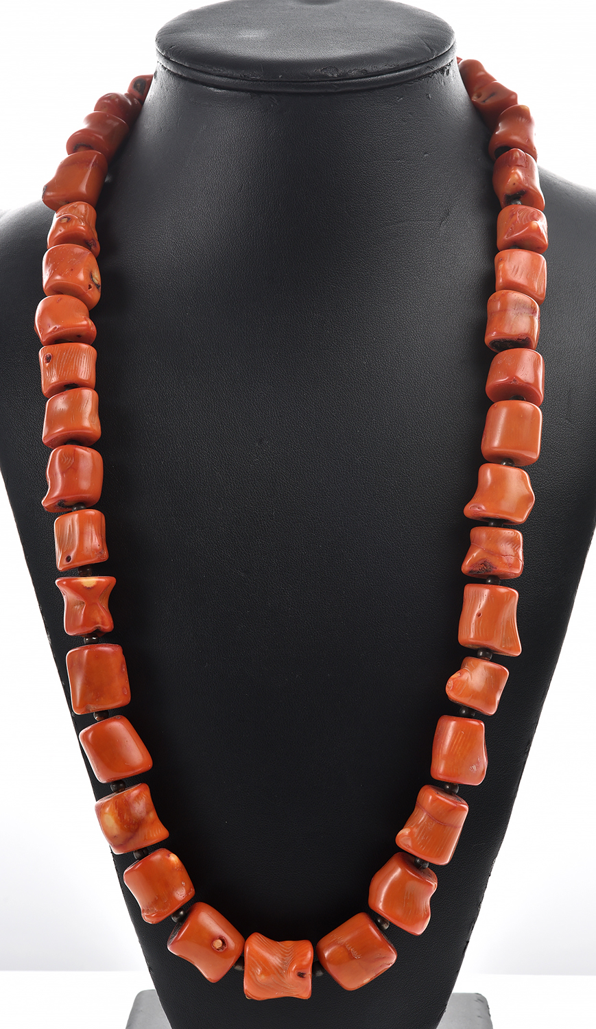 A LARGE DYED CORAL BEAD NECKLACE, TO A T-BAR CLASP, TOTAL LENGTH 72CM