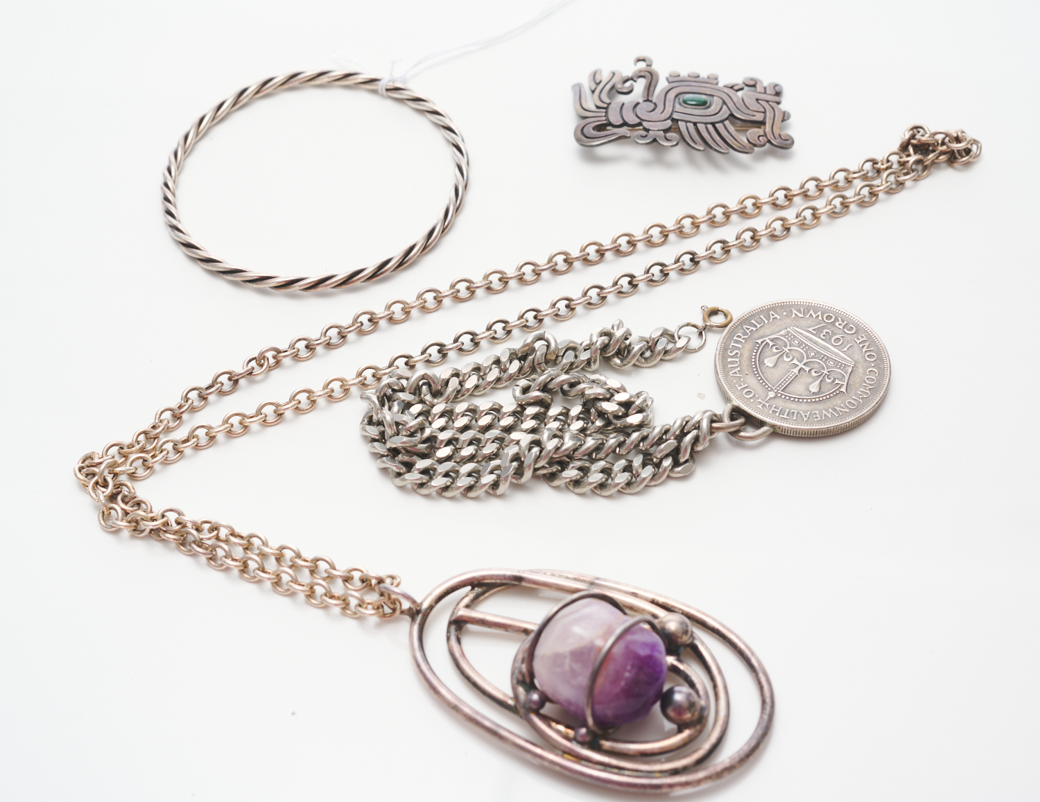 A COLLECTION OF SILVER INCLUDING A 1937 COMMONWEALTH CROWN,A MEXICAN SILVER BROOCH