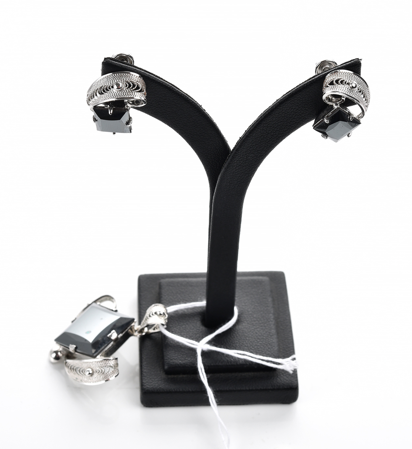 AN ITALIAN VINTAGE HEMATITE SUITE IN SILVER COMPRISING A PENDANT, LENGTH 2.5CM, AND EARRINGS, LENGTH 2CM