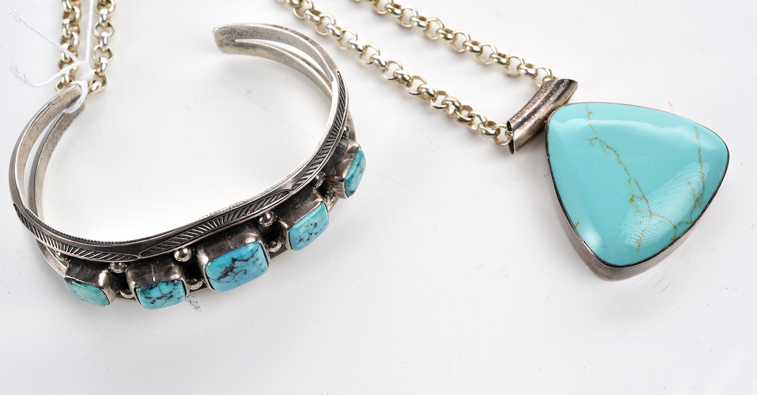 A COLLECTION OF TURQUOISE SET JEWELLERY IN SILVER INCLUDING A PENDANT AND A BANGLE