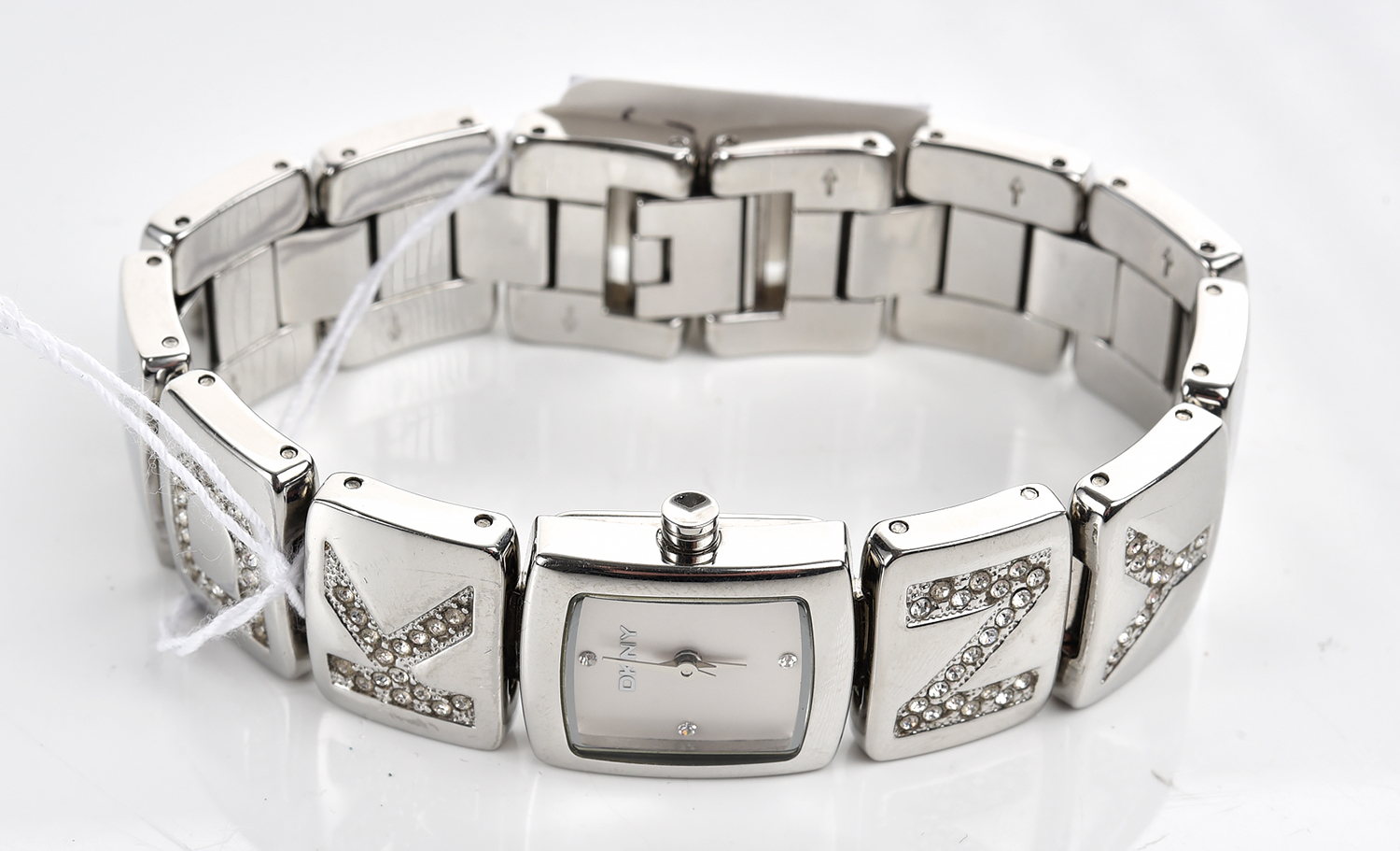 A DKNY RHINESTONE WATCH IN CHROME FINISH