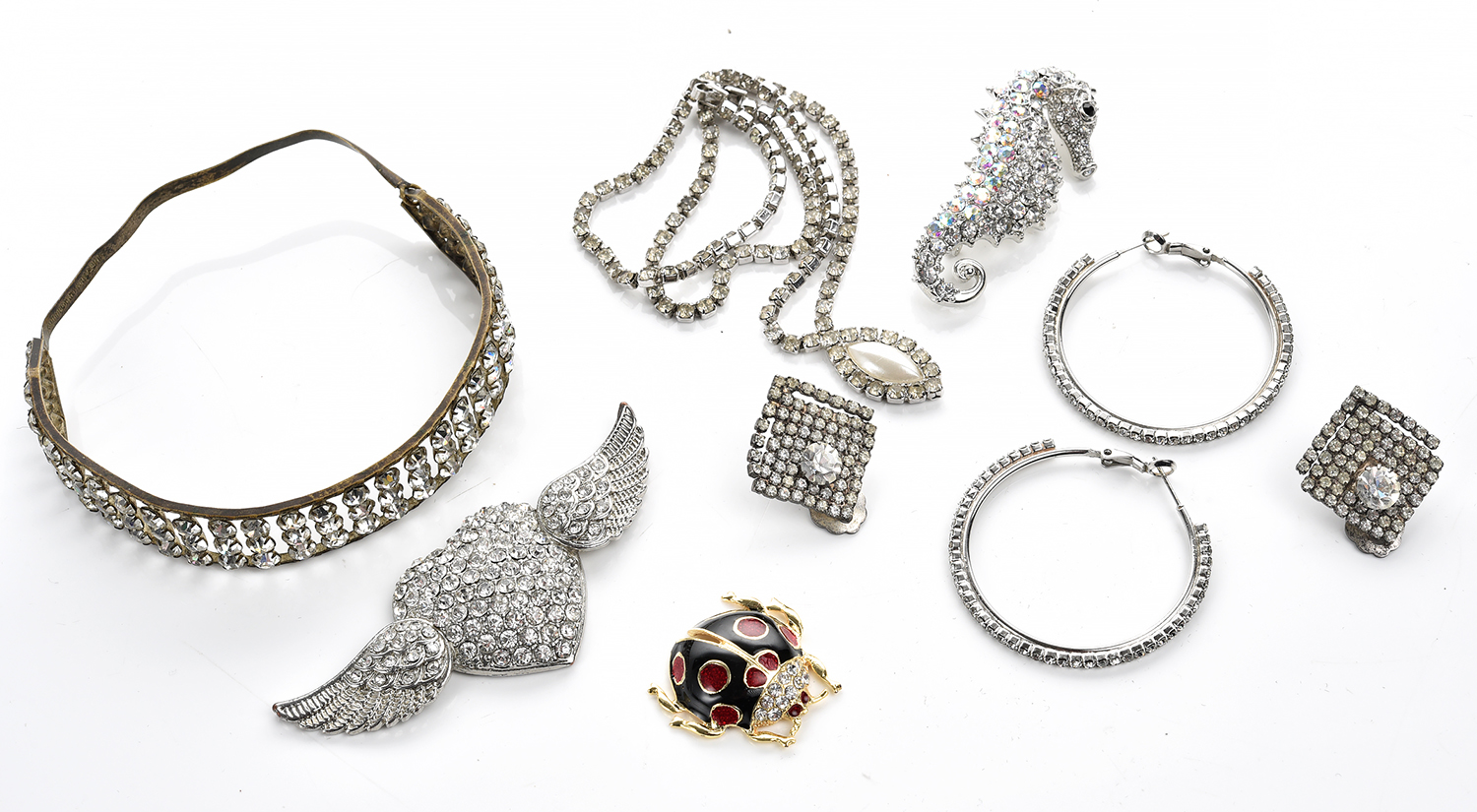 A COLLECTION OF RHINESTONE SET JEWELLERY INCLUDING NECKLACES, EARRINGS, AND BROOCH COMPONENTS