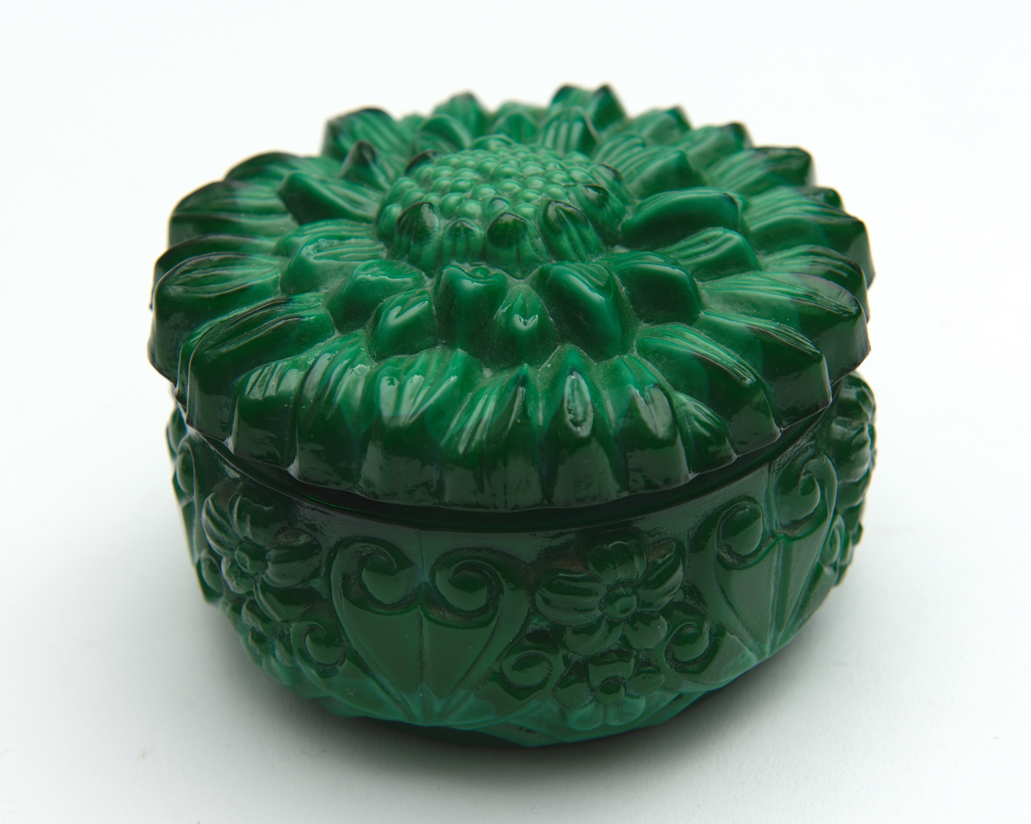 A CZECH MALACHITE GLASS LIDDED BOX, 9.5 CM DIAMETER, 6 CM HIGH