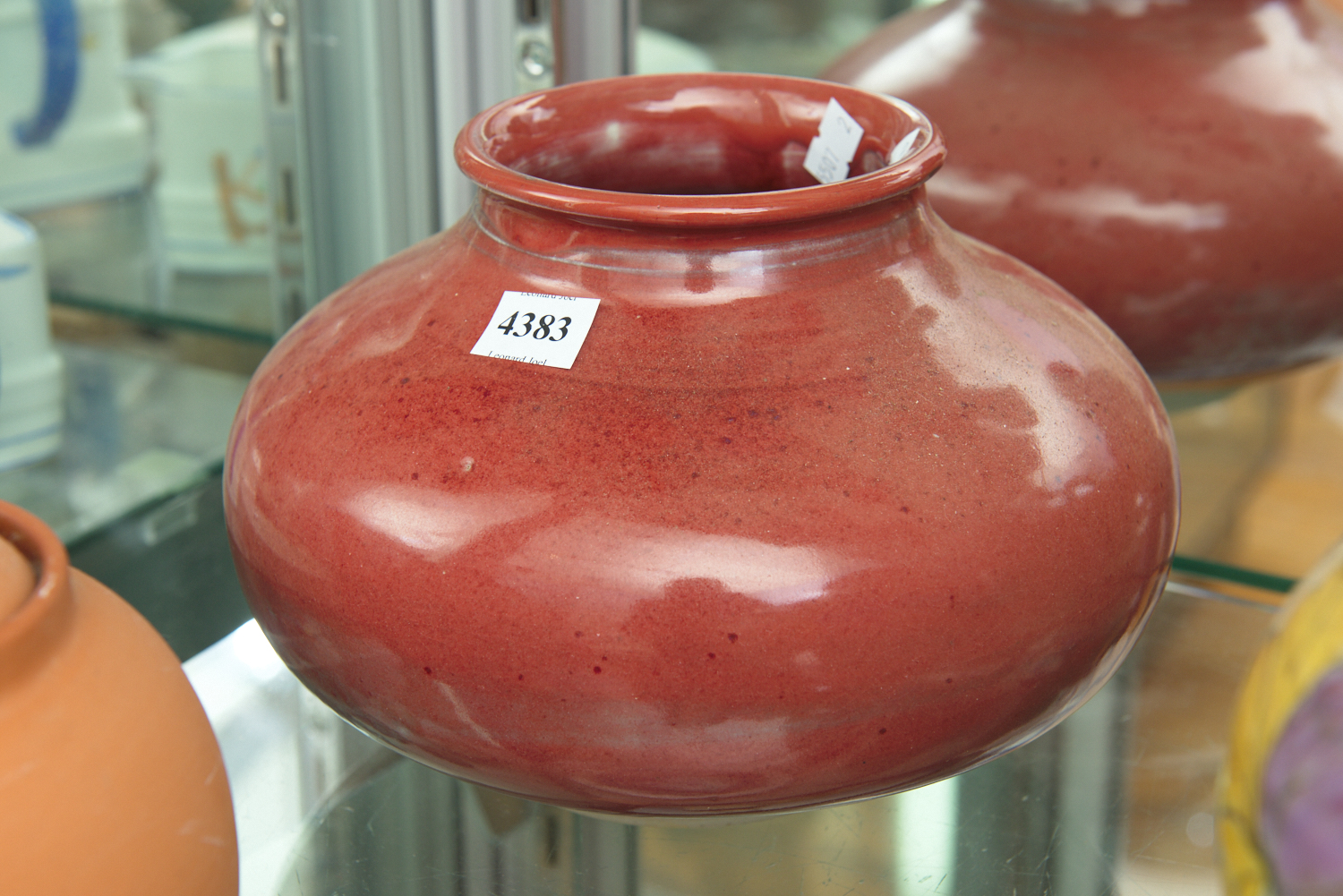 A RED GLAZED STONEWARE VASE, SIGNED H.15CM
