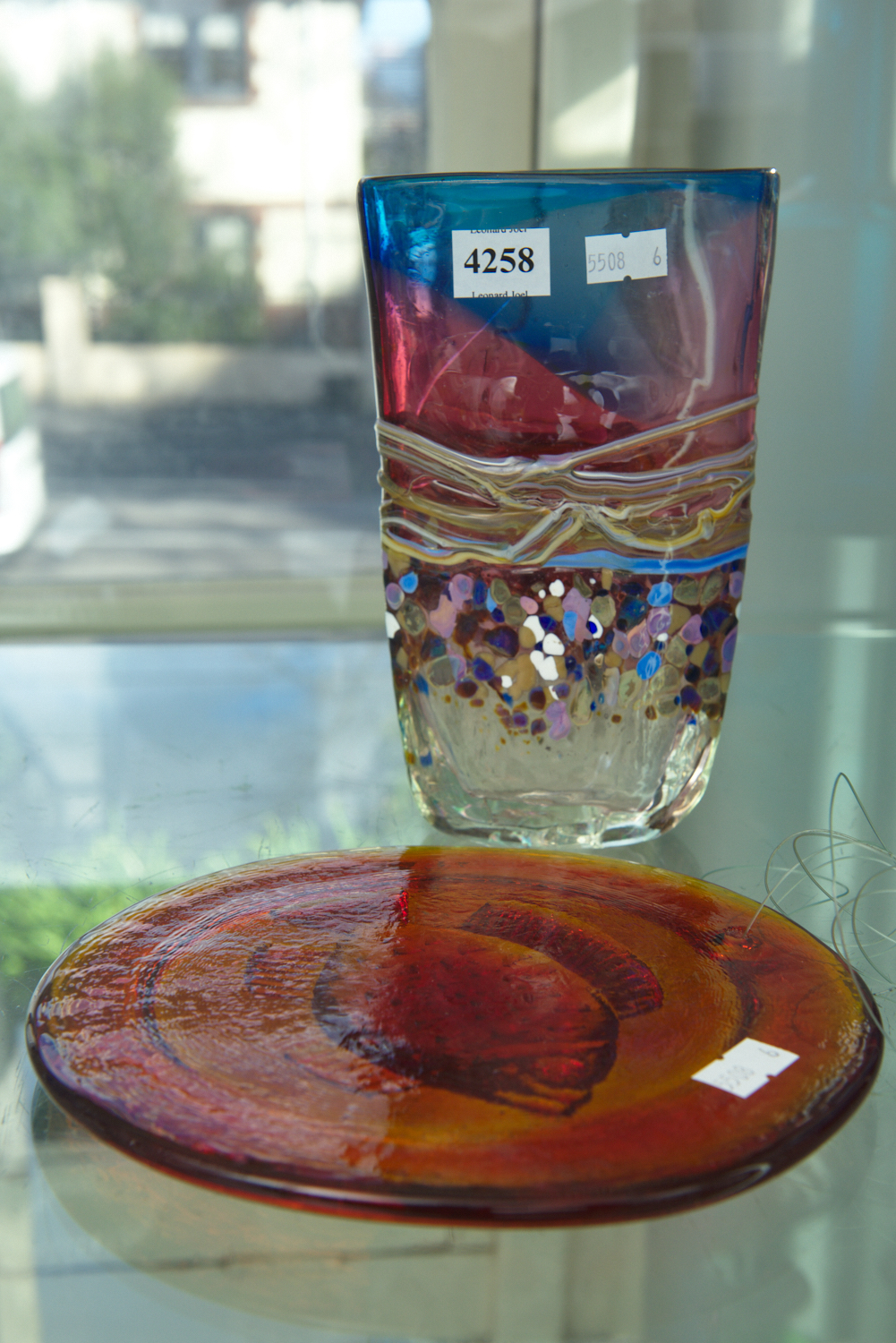 A PETER GOSS STUDIO GLASS VASE (A/F, HAIRLINES) AND AN AMBER GLASS PLATE