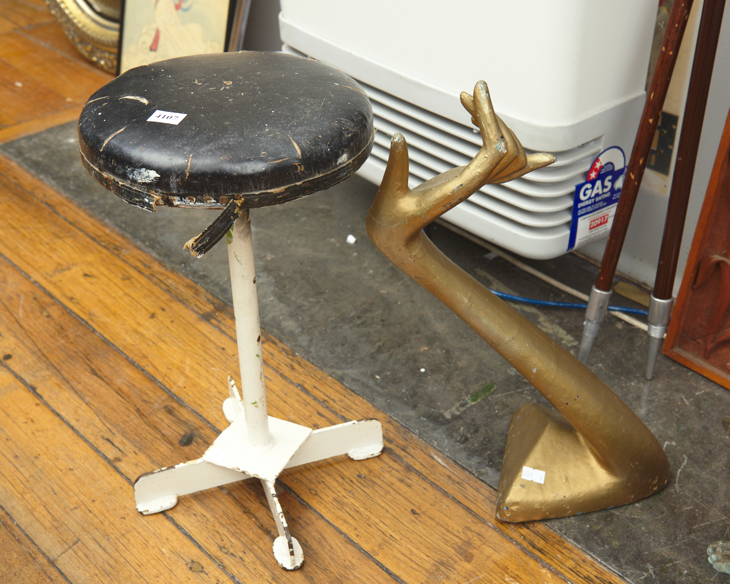 AN INDUSTRIAL STOOL AND A JEWELLERY DISPLAY STAND