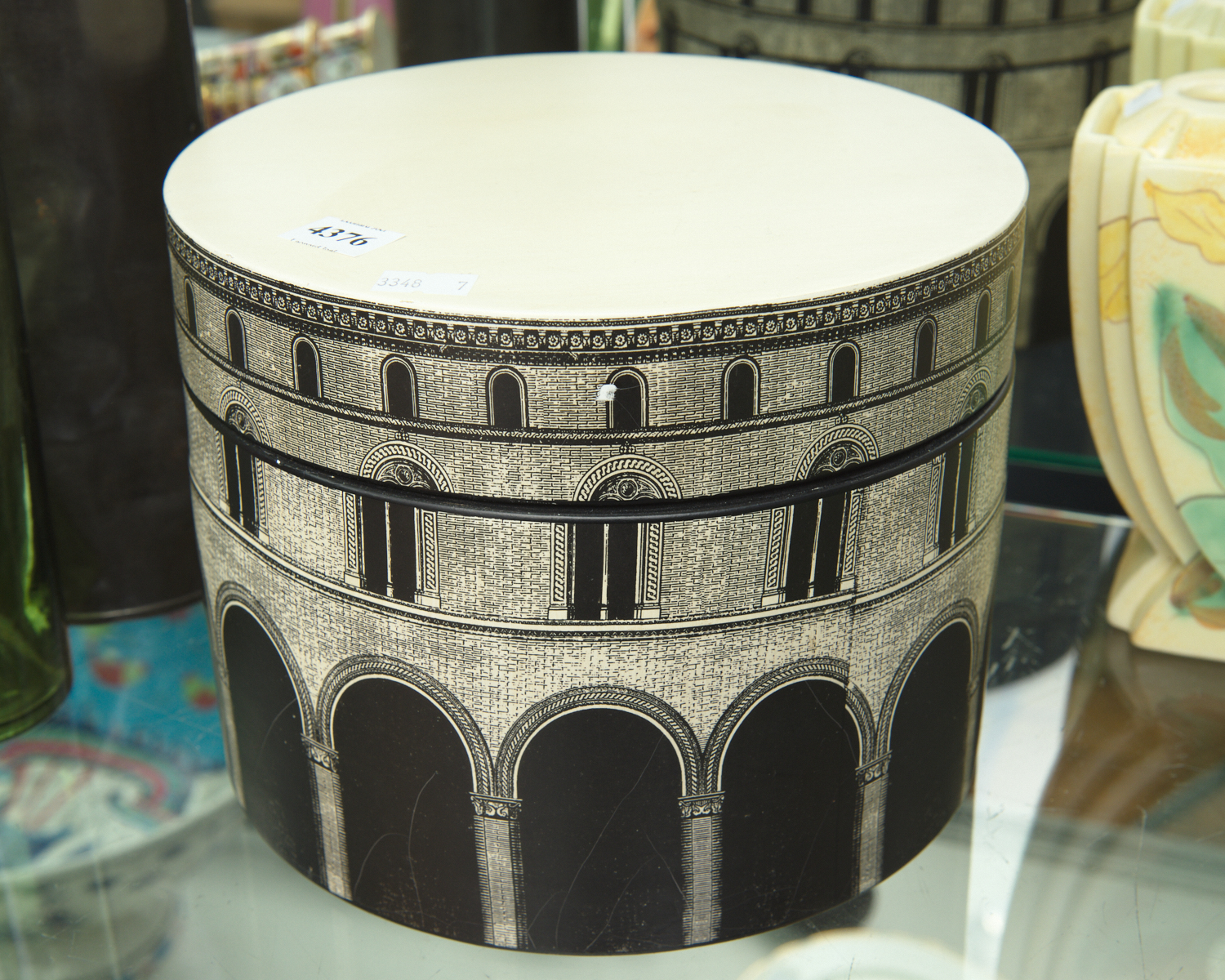 A FORNASETTI STYLE CERAMIC LIDDED BOX