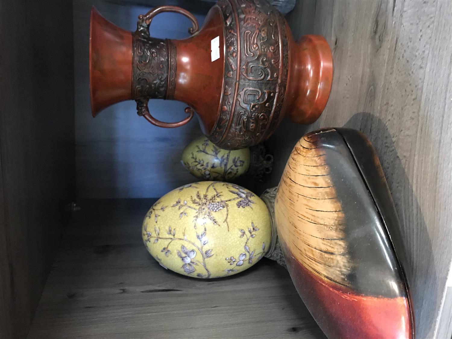 FOUR DECORATIVE ITEMS INCLUDING A BRONZE VASE, A SHELL BOX AND TWO EGG ORNAMENTS, LEONARD JOEL LOCAL DELIVERY SIZE: SMALL