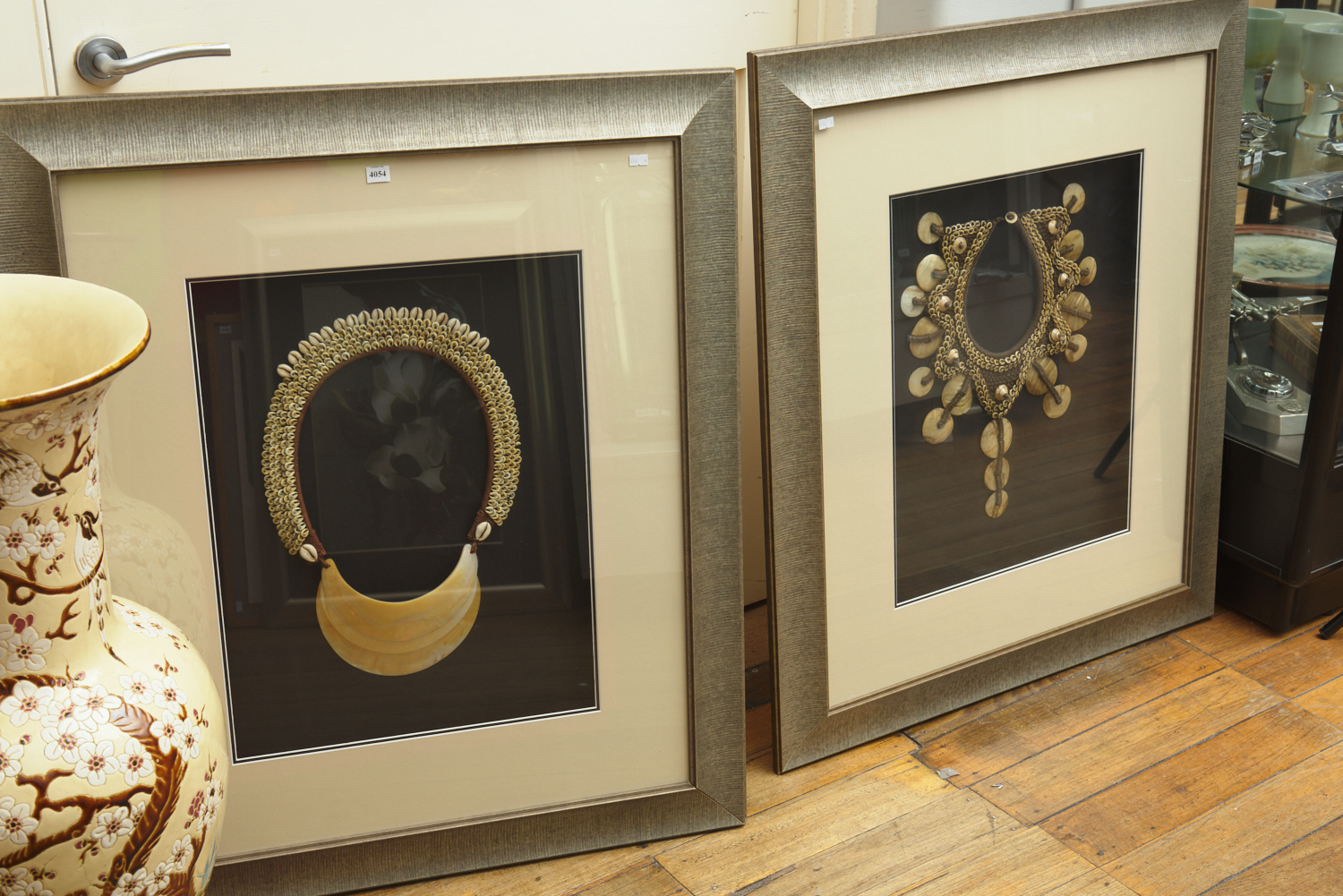 TWO FRAMED AFRICAN SHELL AND FIBRE NECK ADORNMENTS