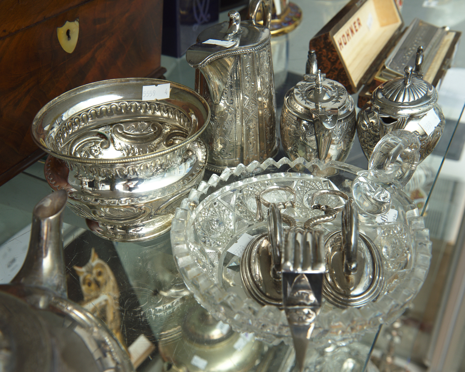A COLLECTION OF SILVERPLATE INCLUDING TEA WARE AND A CANDLESNUFFER