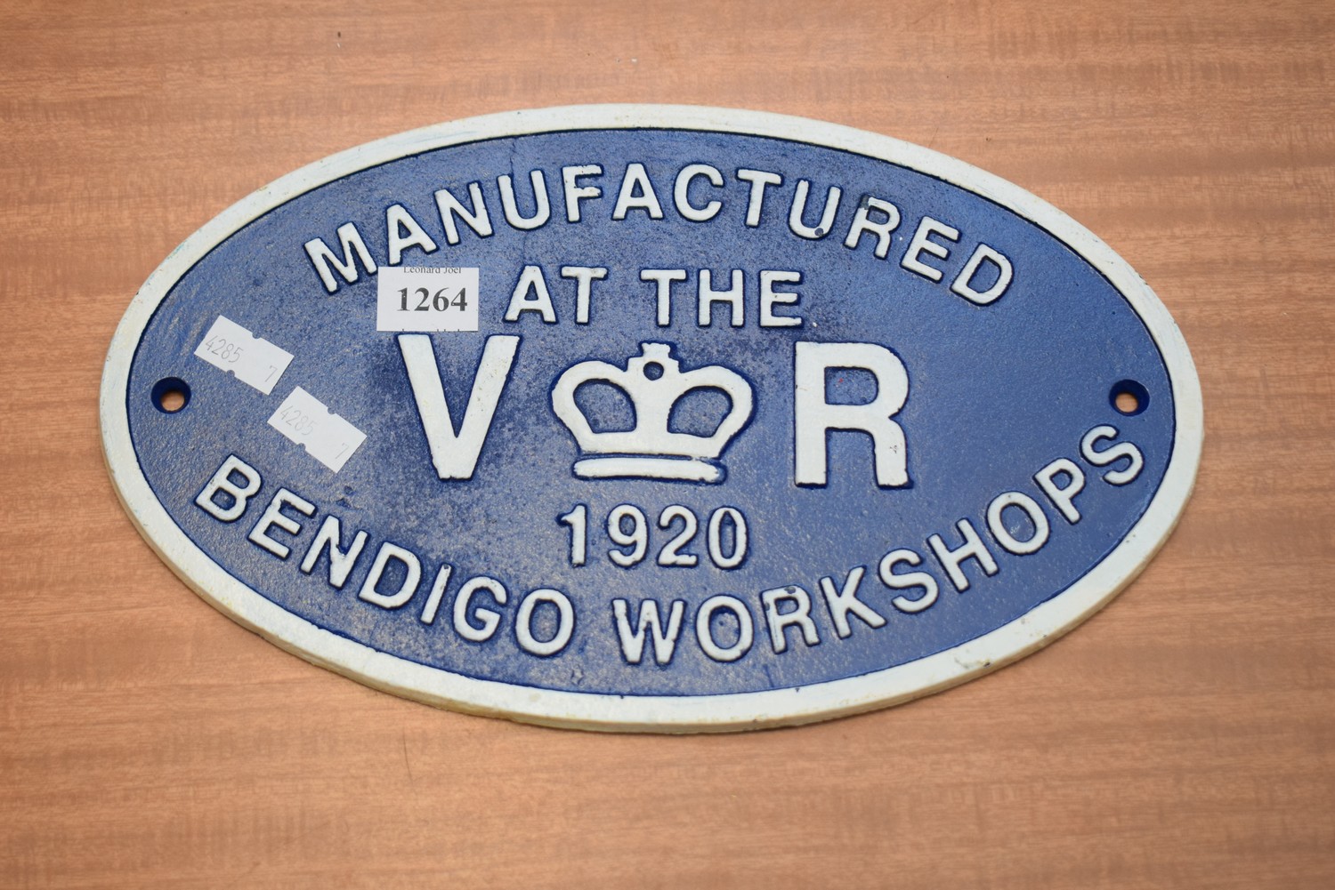 A 'MANUFACTURED AT THE VR WORKSHOPS' METAL PLAQUE (16H x 27W CM)