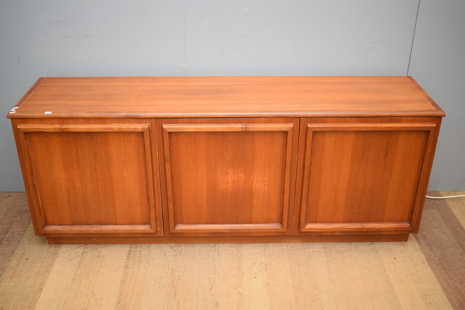 A BURGESS THREE DOOR TEAK SIDEBOARD (A/F) (71H x 182W x 47D CM)