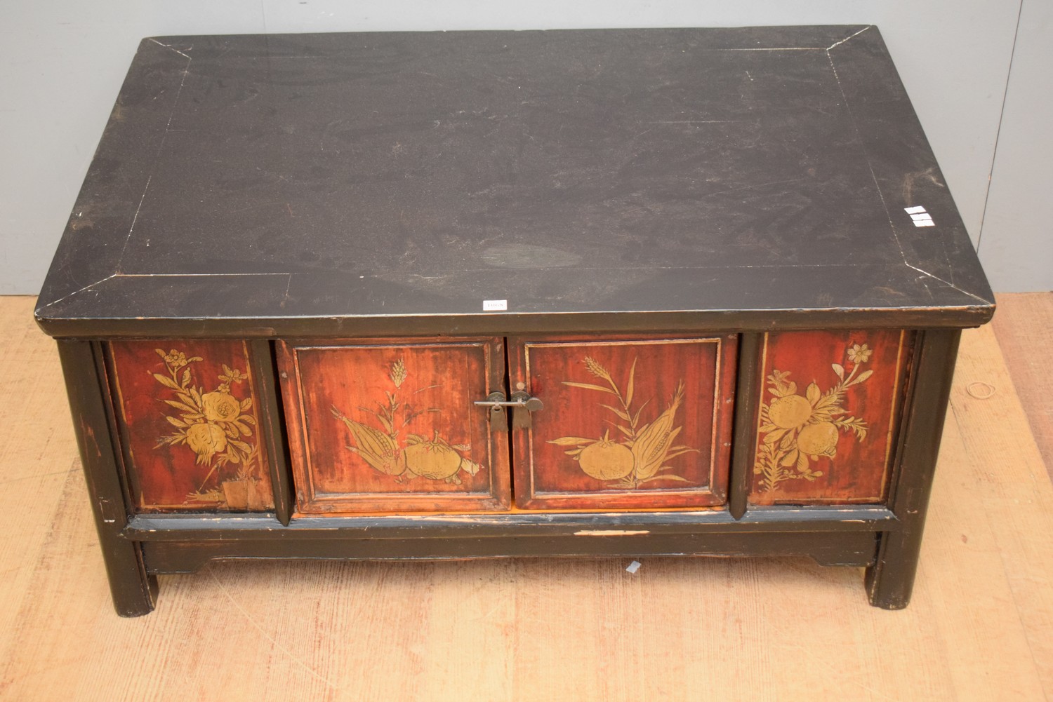 A CHINESE LACQUERED TWO TIER COFFEE TABLE (49H X 107W X 73D CM)