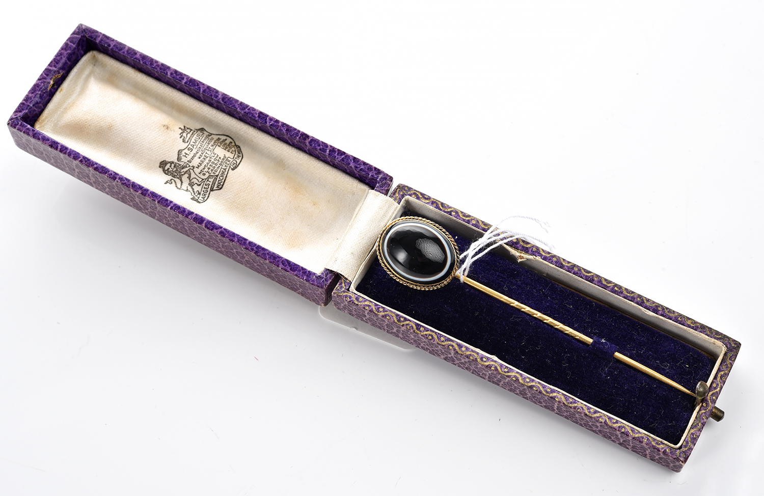 AN ANTIQUE BANDED AGATE STICK PIN, THE MOUNT ACID TESTED IN 9CT GOLD, LENGTH 84MM, BOXED