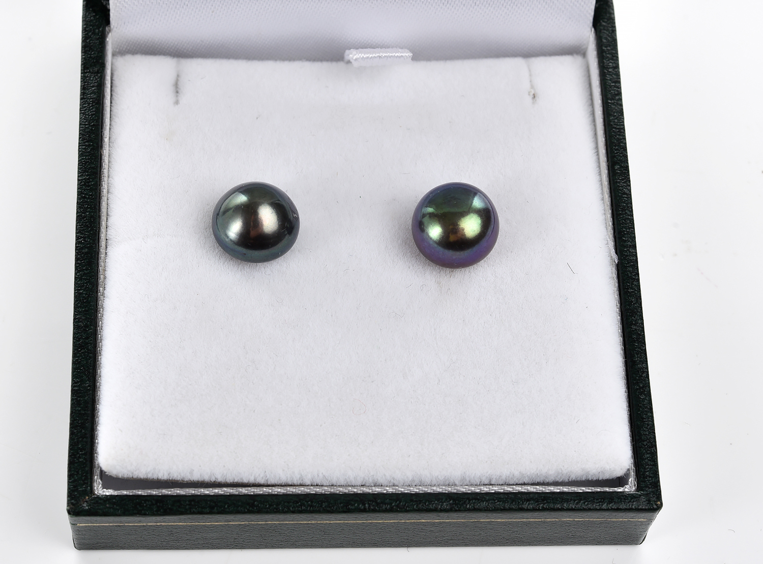 A PAIR OF TAHITIAN PEARL STUD EARRINGS (9.7MM), TO POST AND BUTTERFLY FITTINGS IN 9CT, BOXED