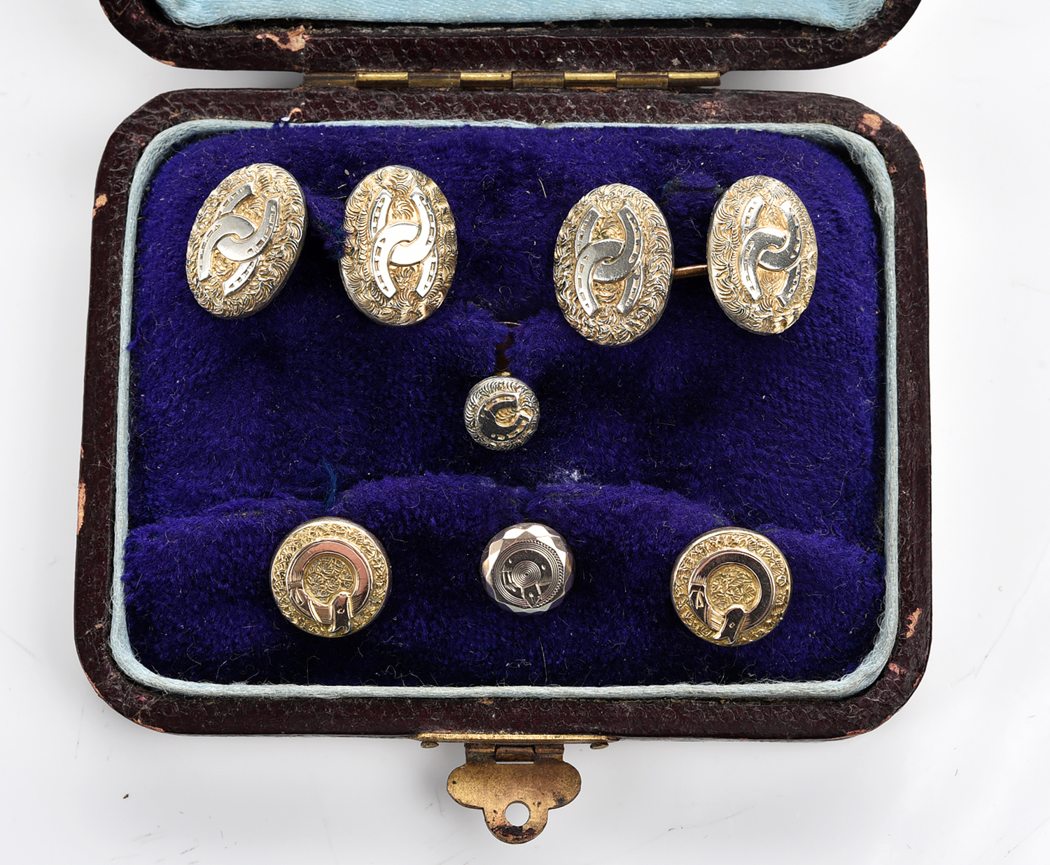 A SET OF SILVER GILT CUFFLINKS FEATURING HORSESHOE, TOGETHER WITH A SET OF SHIRT STUDS, BOXED