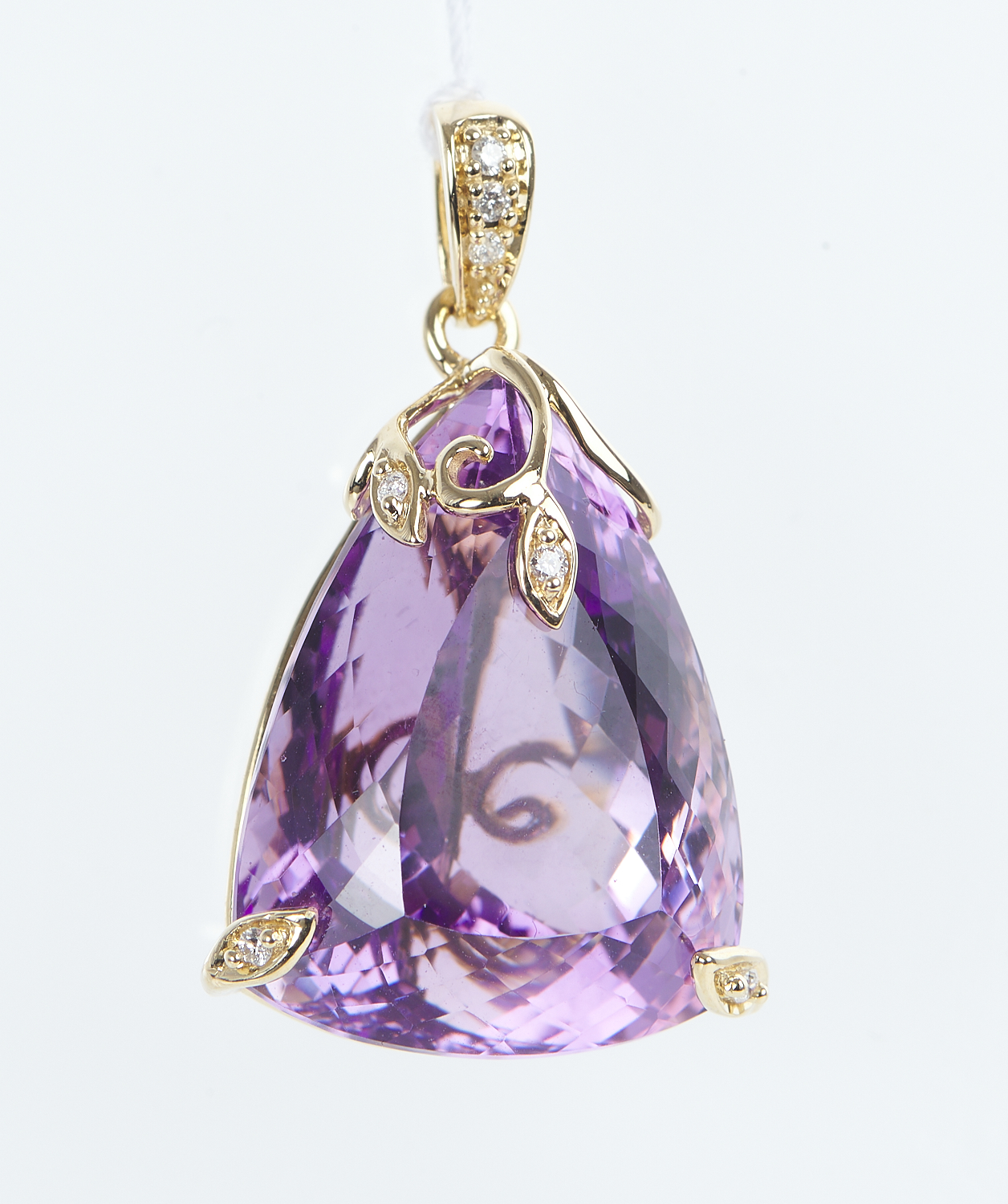 AN AMETHYST AND DIAMOND FOLIATE PENDANT IN 9CT GOLD, THE FANCY CUT AMETHYST WEIGHING 32.36CTS, LENGTH 30MM