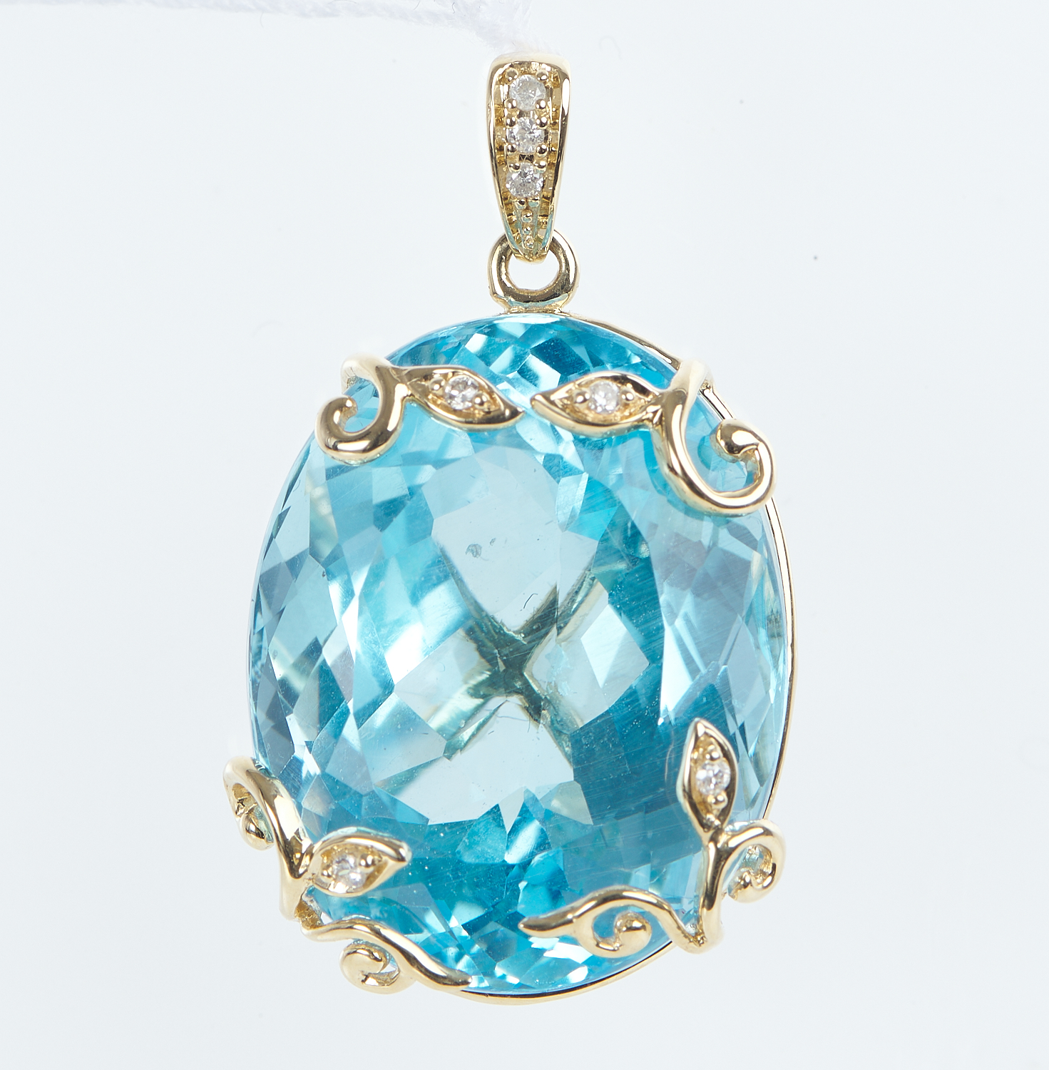 A TOPAZ AND DIAMOND FOLIATE PENDANT IN 9CT GOLD, THE OVAL CUT BLUE TOPAZ WEIGHING 55.79CTS, LENGTH 30MM