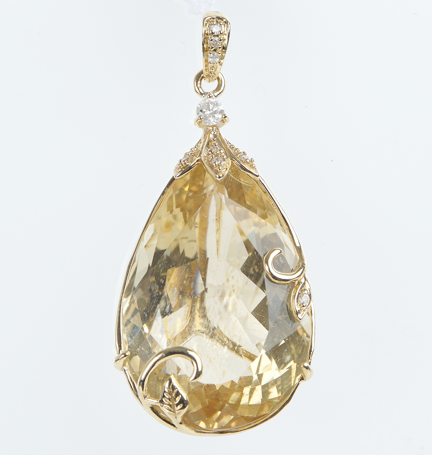 A YELLOW BERYL AND DIAMOND FOLIATE PENDANT IN 9CT GOLD, THE PEAR CUT YELLOW BERYL WEIGHING 41.10CTS, LENGTH 45MM