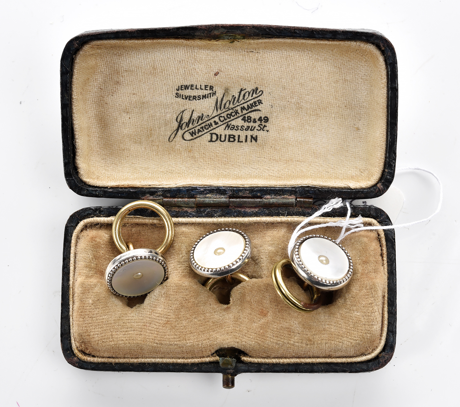 A SET OF THREE MOTHER OF PEARL SHIRT STUDS IN SILVER AND 9CT GOLD, BOXED
