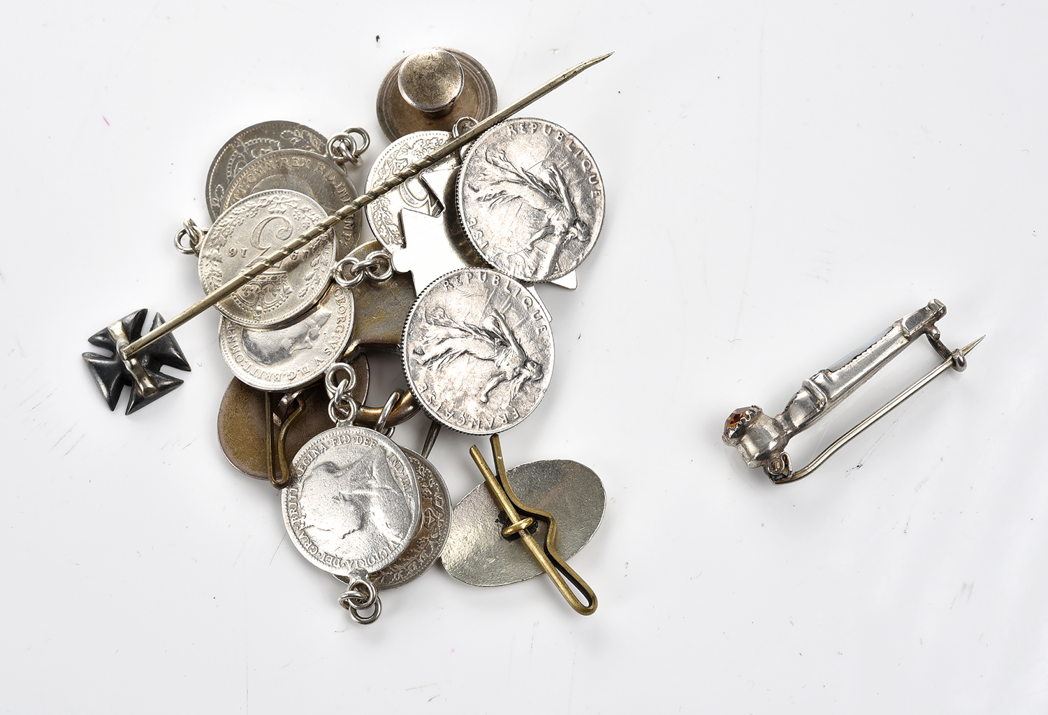 A COLLECTION OF SILVER FINDINGS INCLUDING A COIN FOB, FRENCH COIN BROOCH AND AGATE SET PINS