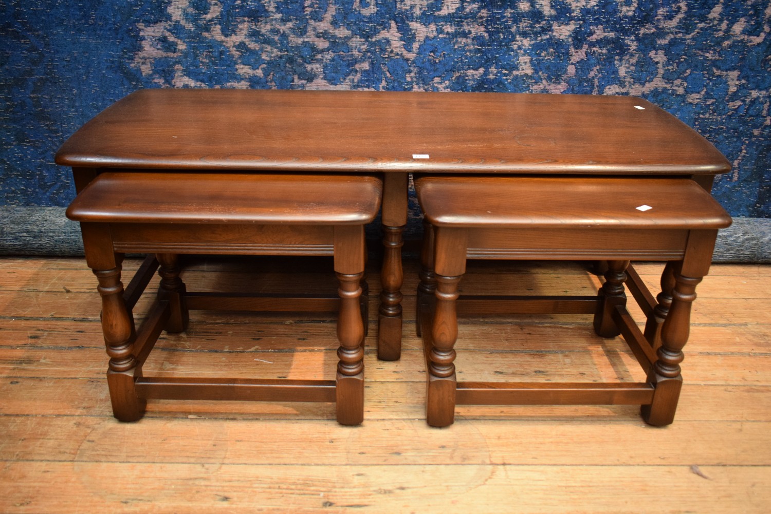 A SOLID ELM ENGLISH MADE NEST OF TABLES (A/F TO TOP) (LARGEST 42H X 115W X 50D CM)
