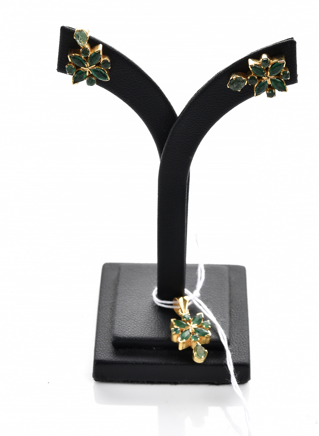 AN EMERALD JEWELLERY SUITE COMPRISING EARRINGS AND A PENDANT (20MM DROP) IN 18CT GOLD, TOTAL WEIGHT 6.3GMS