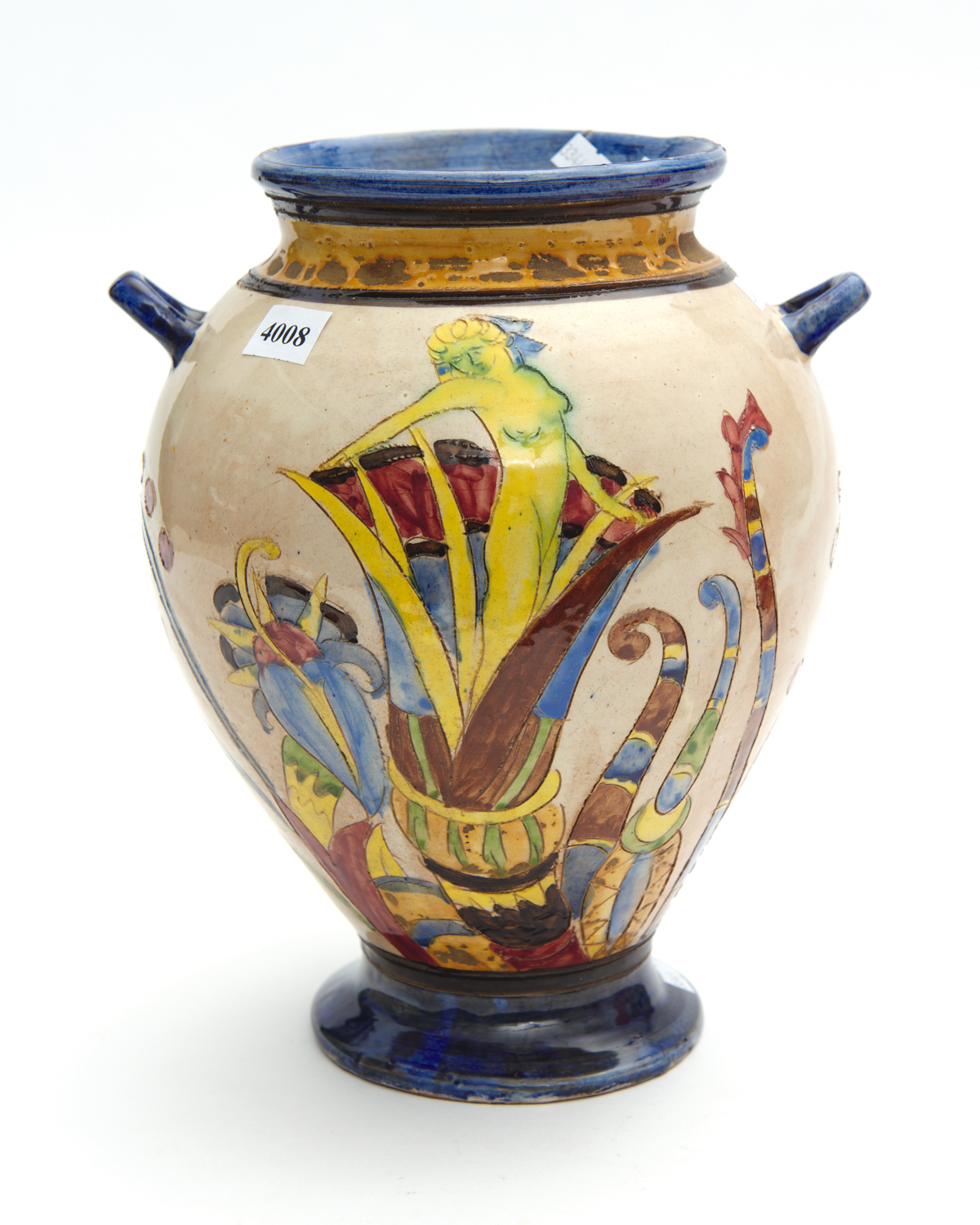 AN ITALIAN HAND PAINTED FAIENCE POTTERY VASE DEPICTING A NUDE WOMAN, MARKED ASSISI, 27 CM HIGH (SMALL DELIVERY)