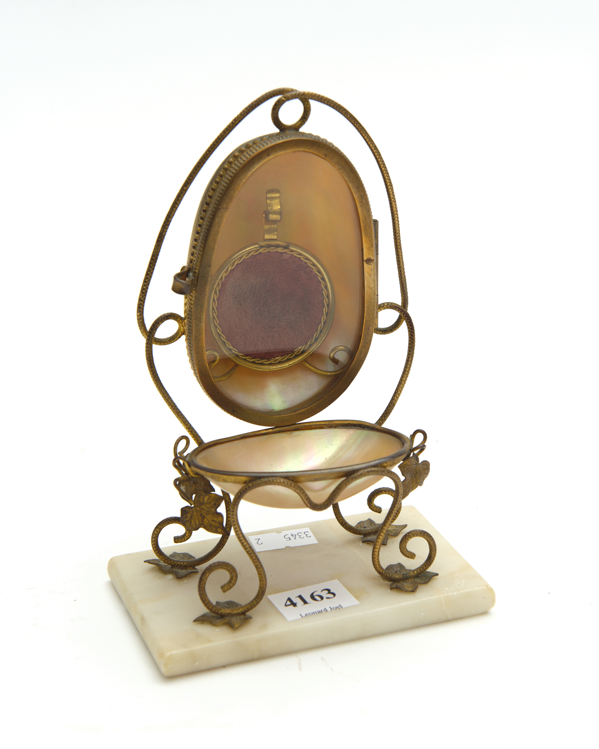 A FRENCH WATCH STAND WITH MOTHER OF PEARL, GILT FRAME AND GLASS DOOR ON A MARBLE BASE, CIRCA 1890, H.17CM (SMALL DELIVERY)