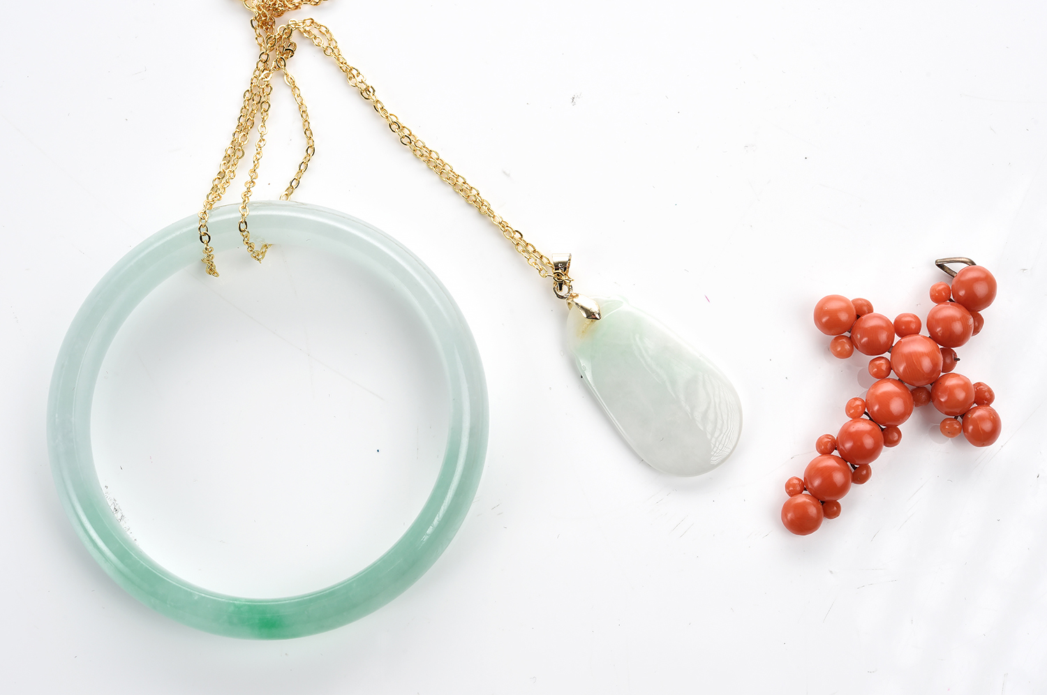 TWO JADE PIECES, COMPRISING A BANGLE AND A PENDANT, TOGETHER WITH A CORAL CROSS PENDANT