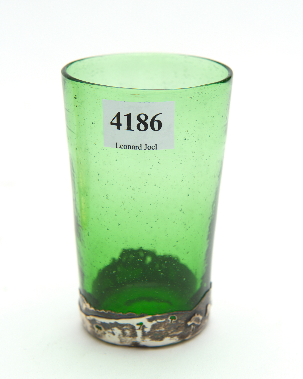 AN ARTS AND CRAFTS HAND BLOWN GREEN GLASS BEAKER WITH STERLING SILVER BASE, 10 CM HIGH