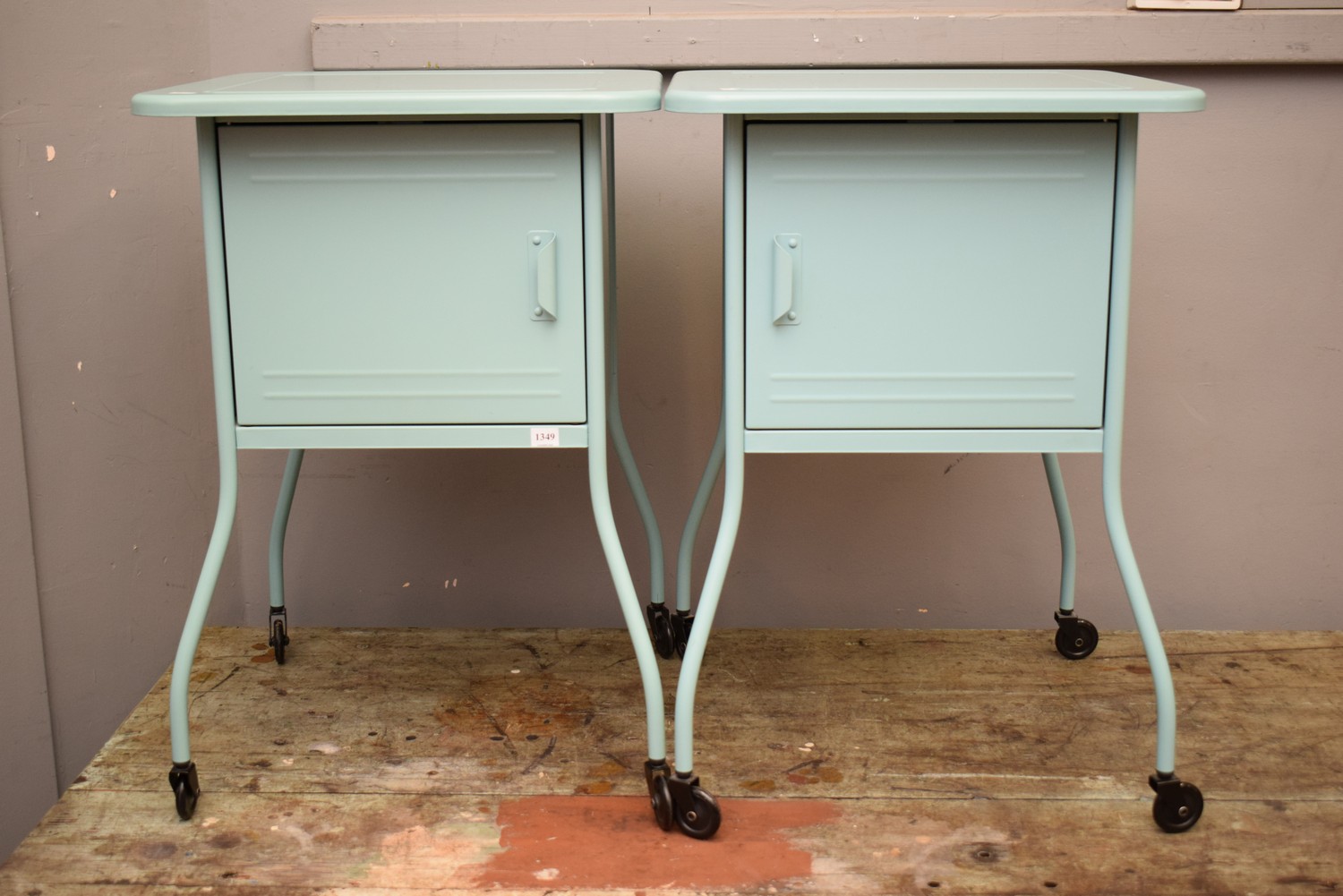 A PAIR OF INDUSTRIAL STYLE SINGLE DRAWER BEDSIDE CABINETS ON WHEELS (67H X 46W X 46D CM)