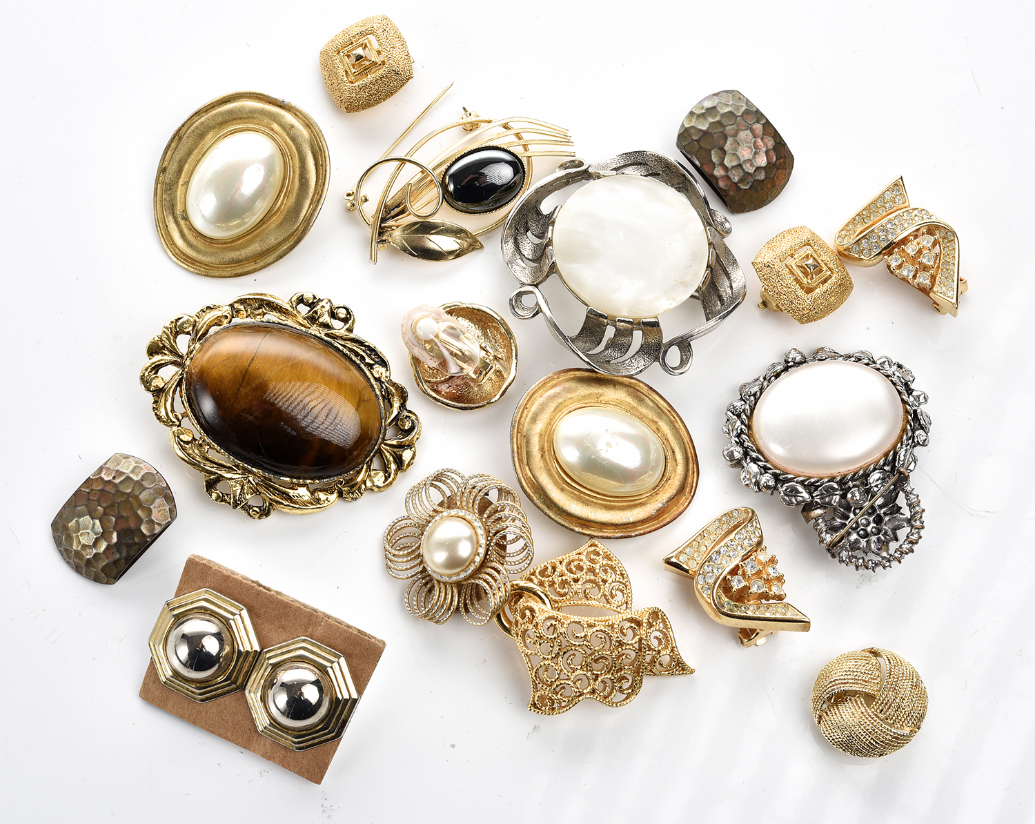 A COLLECTION OF COSTUME BROOCHES AND CLIP EARRINGS INCLUDING CHRISTIAN DIOR , TRIFARI ETC